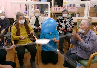 タイミングを合わせて風船を跳ばすゲームをしました。チームの息を合わせ楽しみ、体を温めました。