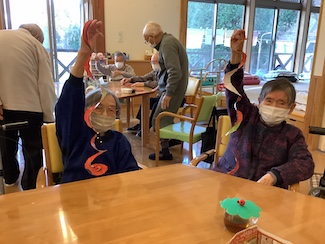 タイミングを合わせて風船を跳ばすゲームをしました。チームの息を合わせ楽しみ、体を温めました。